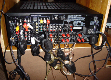RFI problems tend to be worse the lower in frequency and higher in power you go. But compared to the situation just 10 years earlier, the march of technology certainly makes this a much easier challenge to solve than before. Resonant antennas have far less RFI issues than antennas relying on shack-based matching solutions. This is often a tough requirement but in difficult cases, making the antenna naturally resonant at the frequency of operation may solve a lot of your RFI problems and lead to a much lower spousal QRM level. :) The undisputed master of all things RFI is Jim K9YC. Must-read resources include these two: For the state of the art in coax trap construction, see: http://www.audiosystemsgroup.com/CoaxChokesPPT.pdf And for a general primer on RFI topics: http://www.audiosystemsgroup.com/RFI-Ham.pdf Generally speaking, there are one or two wires connecting a device which tend to attract the most RF and - if you can isolate the line - apply your ferrite medicine on those wires alone. Here with 10 bands of operation, testing every permutation is exhausting - especially if you have several items needing a check out. My solution is to take the shot-gun approach - and ferrite each and every wire going in/out of the thing. An example of my AV receiver is show here at the right. The disadvantage of this solution is that it's expensive from an investment in ferrites standpoint. The advantage is in coverage against the many permutations of band and gadget configuration. With more bands of operation and a complicated device like the modern AV switching unit - it's hard to test each combination to be sure you have isolated the right lines - and then isolated them enough. By covering them all, you provide a level of insurance against future combinations. And of course, the new combination that you did not test - will work to be the one which gives you problems on the opening day of your favorite contest or when that famous DX-pedition reef operation finally hears you. Conclusion: RFI in the house is a challenge, but with some ferrites it's easy to contain
