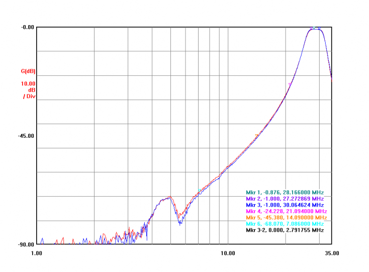 The two filters are mounted in the shack on the right side of the desk table which has become the "command center" - shown at left. Above the two band pass filters are visible the MFJ-998 auto-tuner and the Alpha 76pa. Initial Finished Board Attenuation Plots Two lines on each graph represent the two filter sets. These generally line up closely - variations are due to differences in tune and coil winding primarly. VNA plot measured data shows: Marker 1 - Minimum loss frequency Marker 2 - Low side, 1db down frequency (except on 15m, where it's 2 db down) Marker 3 - High side, 1db down frequency (except on 15m, where it's 2db down) Marker 4 - Ajacent band attenuation Marker 5 - Ajacent band attenuation Marker 6 - Ajacent band attenuation Marker 3 - Marker 2 : calculation of the -1db bandwidth of the filter passband 10m BPF