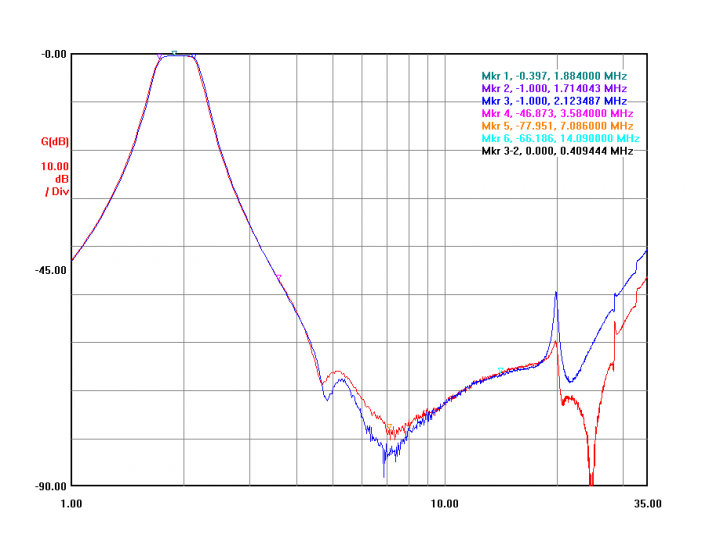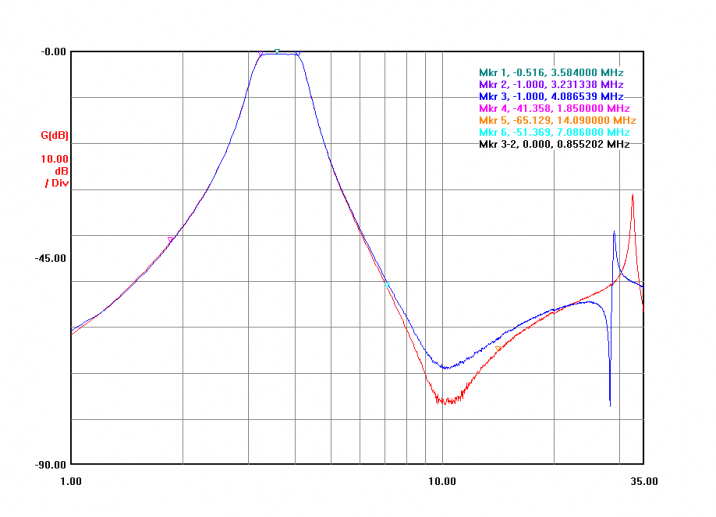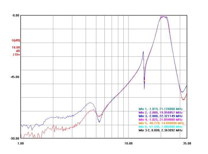 The wide sweeps from the two completed and adjusted filters shown here. The large "bump" in the graph near 4 MHz is not as pronounced with the boards properly grounded and secured in their normal position. To allow for playing around, I purchased a few extra filter board modules. And want to initially add a notch to the 15/20 pair as that is the worst-case coupling combination on the antenna side. Filter fun awaits!!!