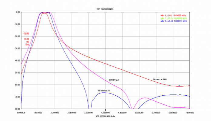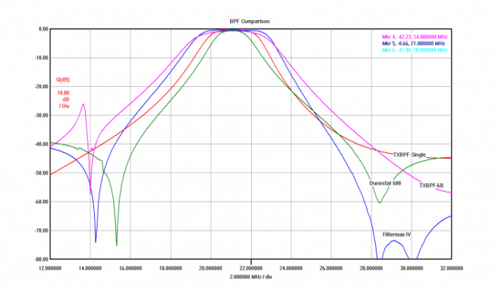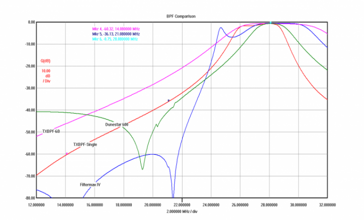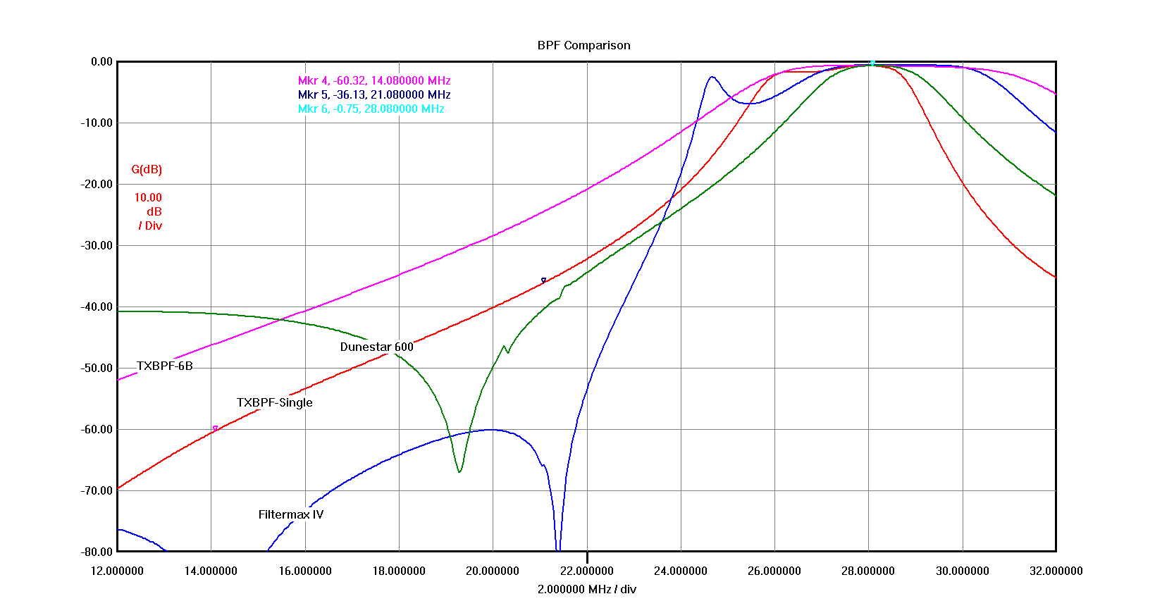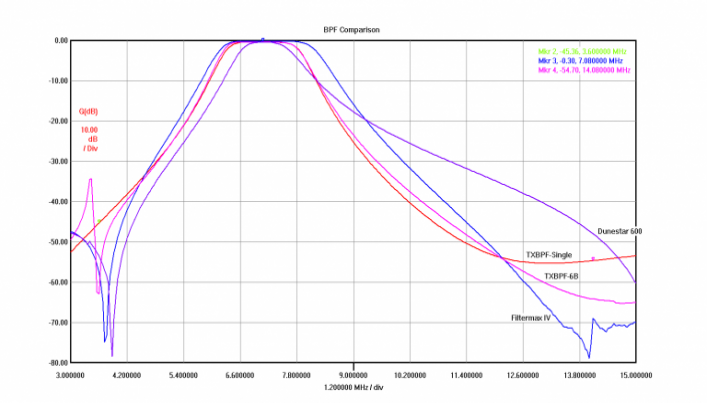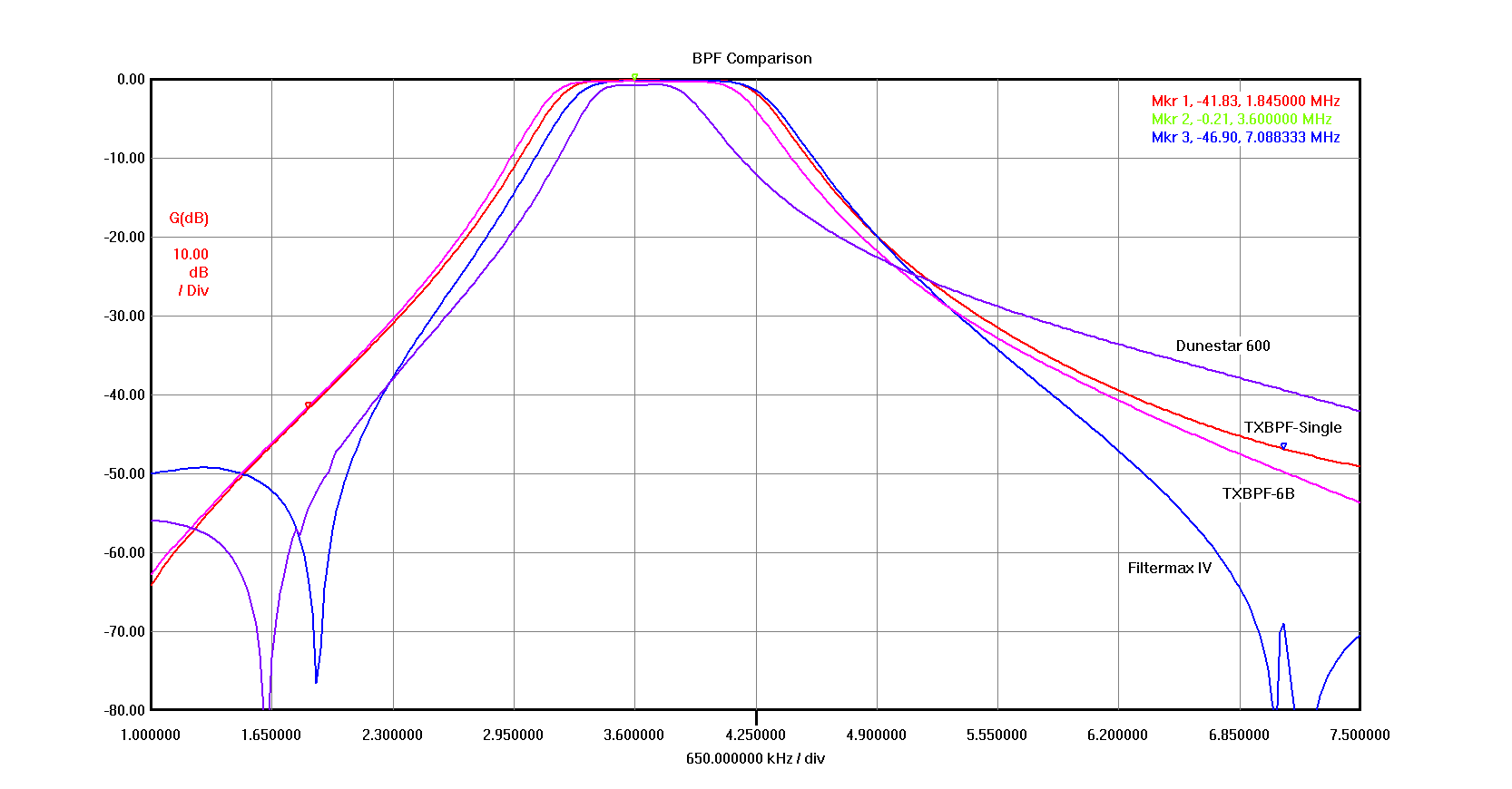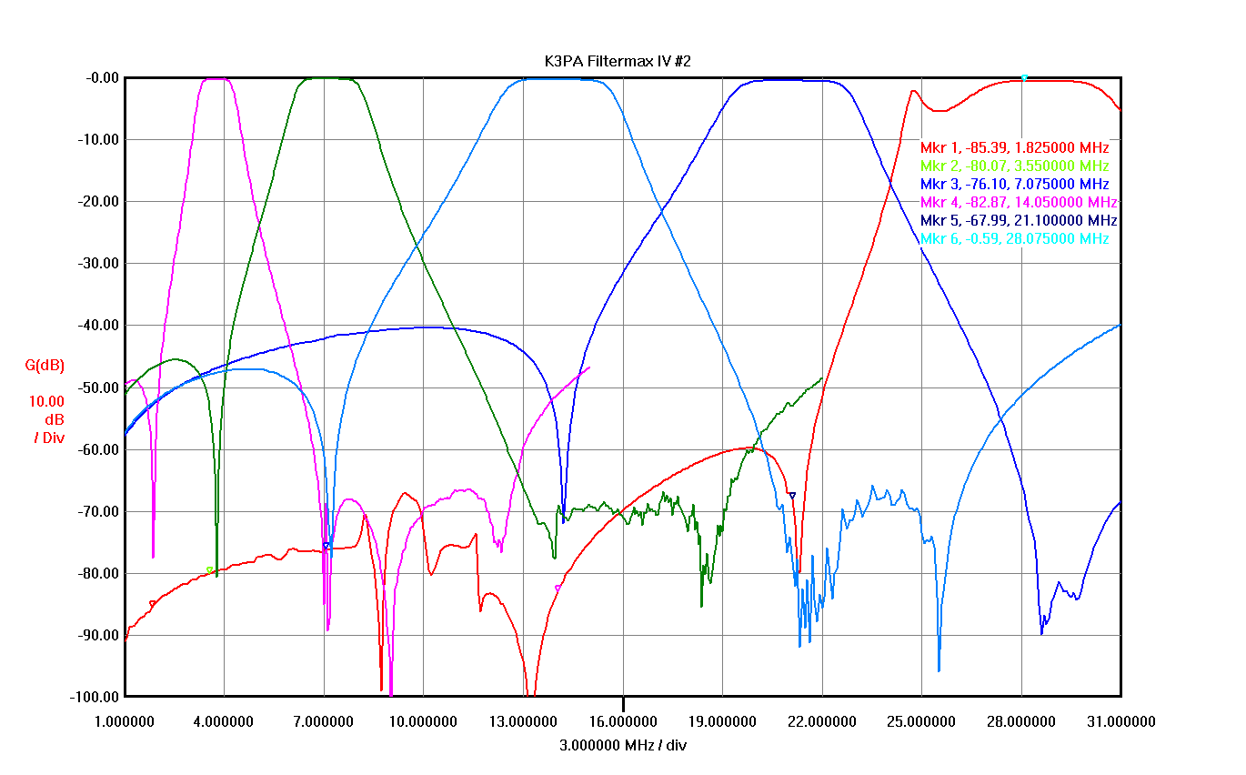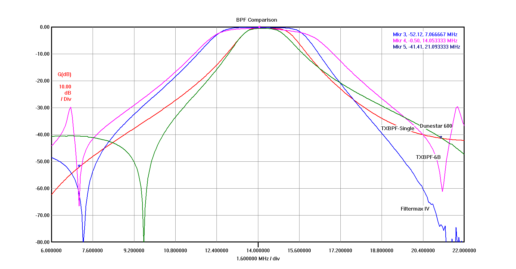 The VNA speaks and the results surprise I've been using the 5B4AGN filters for years with excellent results. So when a friend of mine was talking about setting up So2r, I offered to check out his filters so he could have some measured data to plug into his attenuation calculations. When I stacked the 4 filters on the bench up, the results were surprising. The Array Solutions really looked good. A BPF needs to do two things. First and most importantly, protect the 2nd radio from being damaged by RF out of the first. Here the adjacent band attenuation is the key metric. For this one, "enough to avoid damage" is just as good in the practical sense as an infinite attenuation. And secondly, it needs to attenuate the rig's second harmonic so you can for example work 40m and 80m without having the harmonic content of the 80m transmission wipe out the noise floor on 40m. While the attenuation needed varies with the specific setup, more may not be needed but it definitely does not hurt. Filter loss is another factor, but it's more of a meter mover on the transmit side than big factor on the receiving end. Less loss is better of course, but if you generally run an amp, then a few watts lost to heat in the filter won't matter. I say on the transmit side because the difference between 90w and 100w will not be discernible on the receiving end. Of course some of the biggest reflector battles have been over that statement. Compared in the graphs below are the Array Filtermax, the 5B4AGN and the Dunestar 600 6-band auto-switching filter sets, as well as some 5B4AGN single-band filters I had on the bench at the time from Field Day. The Filtermax performance owes two debts to it's nice plots - first to the design topology, an elliptical (Cauer) type which takes advantage of putting the filter's notches right on the adjacent bands to gain a very nice attenuation boost where it's appreciated most - and secondly they are well trimmed as is reflected in the low loss measured. Having built quite a number of the 5B4AGN filters in the past, I thought perhaps the first unit measured may have not been representative of the normal filter. A second Filtermax purchased a month later had numbers very similar to the first so at least based on those two units, the performance seems to be consistent. On to the data. For each plot, click the graph to view a high resolution view. 5-BAND COMPOSITE PLOTSDunestar 600