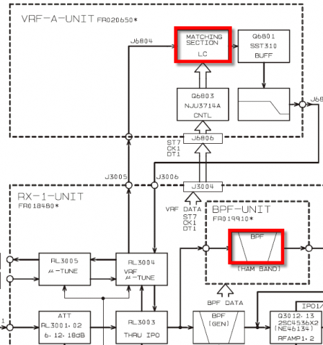 Taking Help Wherever We Can Find It Toward our goal of 135 db total attenuation, the rig preslectors will offer some assistance. The block diagram of the preselector for the FT-2000 is this, showing the VRF and the preselector (BPF UNIT). The VRF analysis will be shown on another page HERE