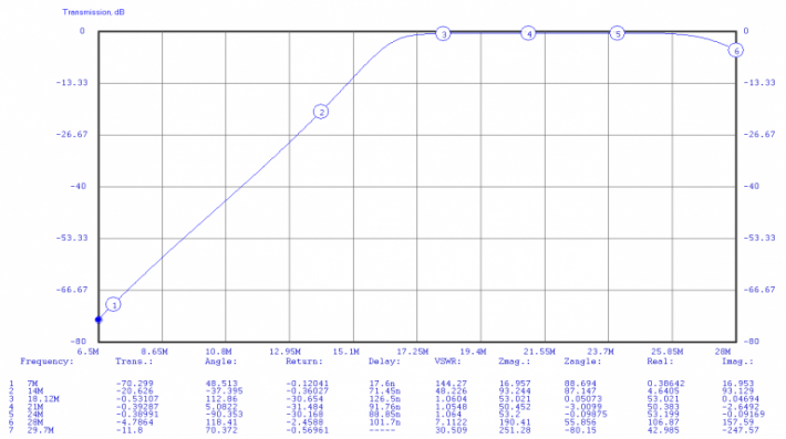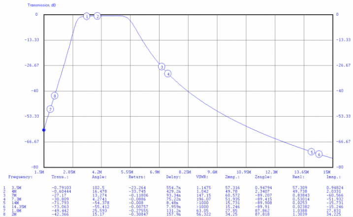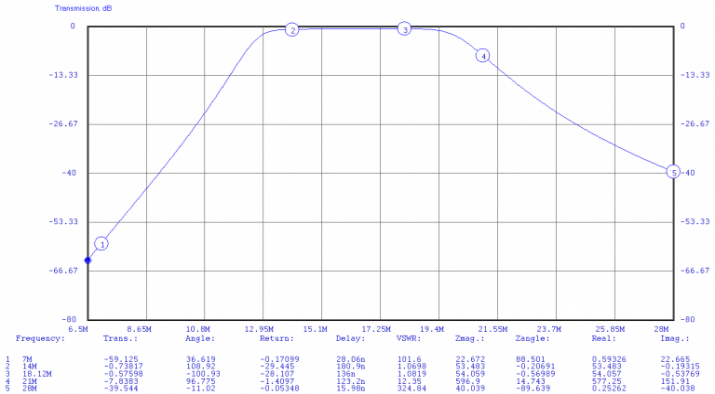 Because of the Elsie program limits, only 7 poles could be simulated each time. So I looked at the effects of the LPF and HPF section for each filter of interest separately. With planned operation of the FT-2000 restricted to 20 and 40M, a total of 4 schematics were built and simulated. An example of the resulting transmission plot is shown here:
